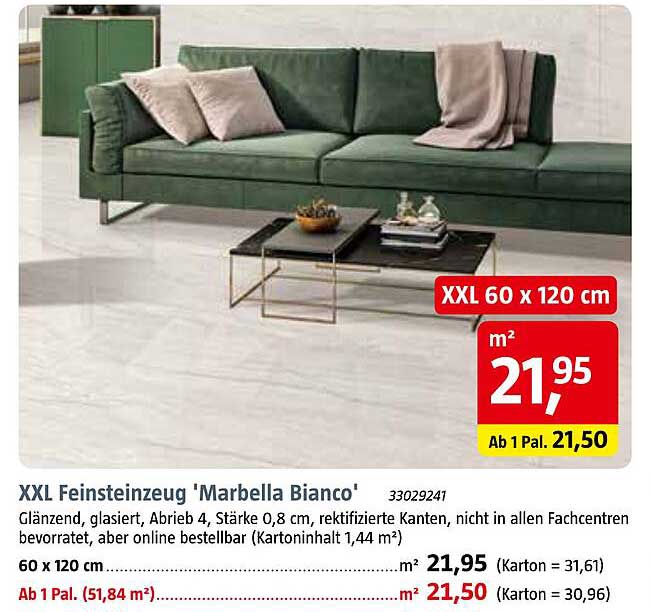 Das XXL Feinsteinzeug 'Marbella Bianco' ist die perfekte Wahl für alle, die Wert auf Stil und Qualität legen. Vom 1. November bis zum 29. November 2025 erhalten Sie die Möglichkeit, dieses elegante Fliesenmaterial zu einem besonders attraktiven Preis zu erwerben. Mit dem großformatigen Format von 60 x 120 cm wird Ihr Raum nicht nur optisch größer, sondern auch ansprechender, was Ihre Einrichtungsideen zum Leben erweckt.