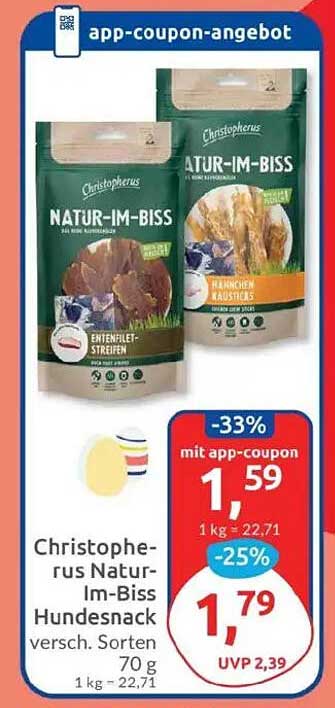 Sehen Sie sich jetzt das Christophorus Natur-Im-Biss Hundesnack, verschiedene Sorten (70 g) Angebot im Budni Prospekt an. Dieses Angebot ist gültig von 07.04.2025 bis 12.04.2025.