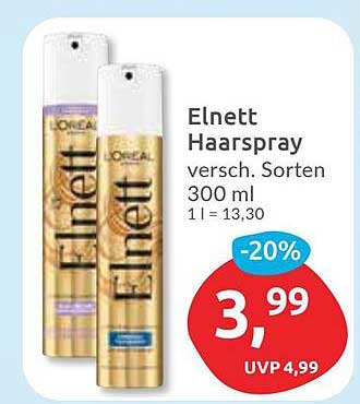 Entdecken Sie das großartige Elnett Haarspray Angebot im neuesten Budni Prospekt. Neben diesem Angebot finden Sie noch viele weitere attraktive Rabatte. Sie können das Elnett Haarspray einfach online über die Budni Website bestellen oder in einem Geschäft in Ihrer Nähe kaufen.