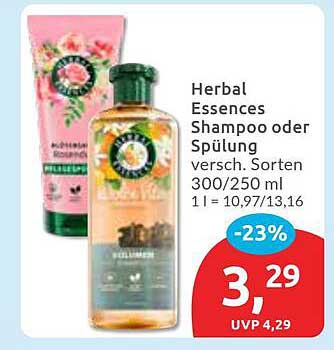 Der aktuelle Preis für das Herbal Essences Shampoo oder die Spülung liegt bei nur 3,29 Euro, während der unverbindliche Verkaufspreis bei 4,29 Euro liegt. Das bedeutet eine Ersparnis von 1 Euro oder 23%! Nutzen Sie diese Gelegenheit und sparen Sie, während Sie gleichzeitig in Ihre persönliche Pflege investieren.