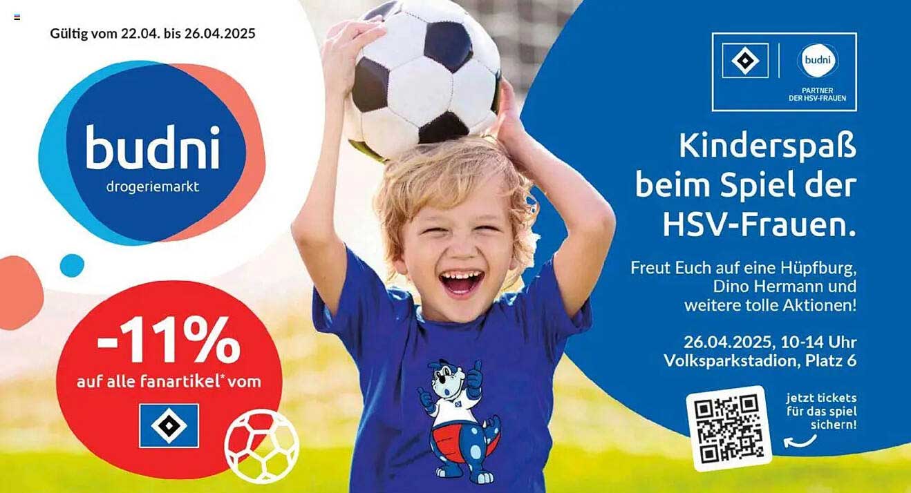 Sehen Sie sich jetzt das Kinderspaß beim Spiel der HSV-Frauen mit -11% auf alle Fanartikel Angebot im Budni Prospekt an. Dieses Angebot ist gültig von 22.04.2025 bis 26.04.2025.
