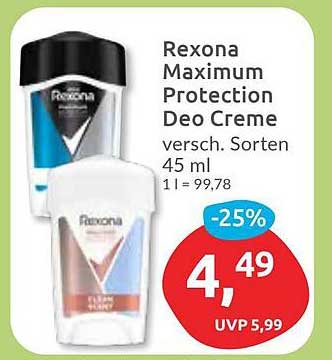 Entdecken Sie das großartige Rexona Maximum Protection Deo Creme Angebot im neuesten Budni Prospekt. Neben diesem Angebot finden Sie noch viele weitere attraktive Rabatte. Sie können das Rexona Maximum Protection Deo Creme einfach online über die Budni Website bestellen oder in einem Geschäft in Ihrer Nähe kaufen.