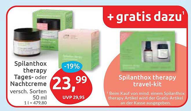 Erleben Sie die revitalisierende Wirkung der Spilanthox therapy Tages- oder Nachtcreme, die ab dem 21. Juli 2025 für kurze Zeit im Angebot ist. Diese Creme ist nicht nur eine intensive Feuchtigkeitspflege, sondern auch ein innovatives Produkt, das Ihre Haut strahlen lässt. Ob für den Tag oder die Nacht, diese Creme ist eine perfekte Ergänzung Ihrer täglichen Pflegeroutine. Nutzen Sie die Gelegenheit, sich selbst etwas Gutes zu tun und Ihre Haut zu verwöhnen.
