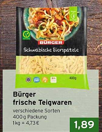 Entdecken Sie die köstlichen Bürger frischen Teigwaren in der Sorte Schwäbische Eierspatzle. Dieses Angebot ist nicht nur preiswert, sondern auch ideal für schnelle, schmackhafte Gerichte. Perfekt für eine gesunde und gemütliche Essenszubereitung – ideal für die Familie oder für ein schnelles Abendessen mit Freunden.