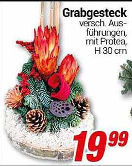 Sehen Sie sich jetzt das Grabgesteck mit Protea, H 30 cm Angebot im CENTERSHOP Prospekt an. Dieses Angebot ist gültig von 27.10.2025 bis 31.10.2025.