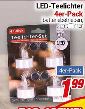 Sehen Sie sich jetzt das LED-Teelichter 4er-Pack batteriebetrieben, mit Timer Angebot im CENTERSHOP Prospekt an. Dieses Angebot ist gültig von 20.10.2025 bis 26.10.2025.