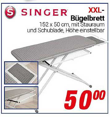 Sehen Sie sich jetzt das XXL-Bügelbrett von SINGER - 152 x 50 cm, mit Stauraum und Schublade, Höhe einstellbar Angebot im CENTERSHOP Prospekt an. Dieses Angebot ist gültig von 30.06.2025 bis 05.07.2025.