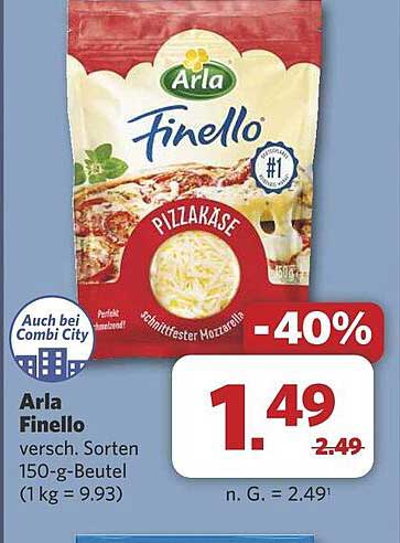 Sehen Sie sich das Arla Finello Pizzakäse Angebot bei Combi an! Dieses fantastische Angebot ist jetzt im neuesten Combi Prospekt verfügbar. Nutzen Sie diese Chance und sparen Sie viel bei Ihrem Einkauf.