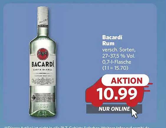 Sehen Sie sich jetzt das Bacardí Rum - 0,7 l Flasche, nur online für 10,99 € Angebot im Combi Prospekt an. Dieses Angebot ist gültig von 27.07.2025 bis 02.08.2025.