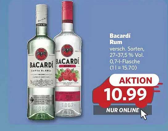 Entdecken Sie die exquisiten Sorten von Bacardí Rum, die aktuell in einer attraktiven Aktion erhältlich sind. Bei einem Preis von nur 10,99 € pro 0,7 l-Flasche ist dies eine hervorragende Möglichkeit, den beliebten Rum für Ihre nächste Feier zu ergattern. Bacardí steht für Qualität und Tradition – eine Kombination, die man nicht verpassen sollte.