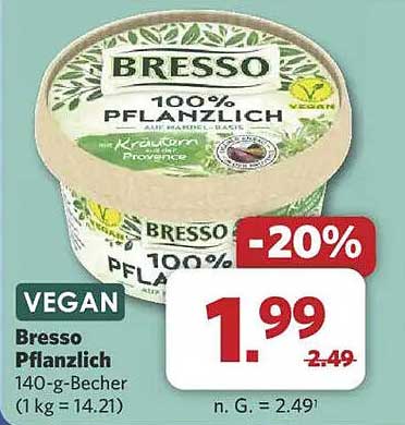 Sehen Sie sich jetzt das Bresso Pflanzlich 100% pflanzlich, 140-g-Becher Angebot im Combi Prospekt an. Dieses Angebot ist gültig von 20.10.2025 bis 25.10.2025.