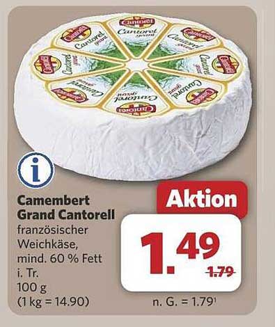 Normalerweise liegt der Preis für diesen köstlichen Camembert bei 1,79 €, jedoch profitieren Sie jetzt von einem attraktiven Aktionspreis von nur 1,49 €. Dies entspricht einer Ersparnis von 30 Cent – ein tolles Angebot, das Ihnen die Möglichkeit gibt, sich diesen Gaumenschmaus zu einem unschlagbaren Preis zu gönnen.