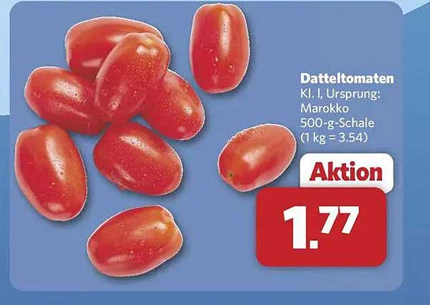 Die Datteltomaten sind Qualitätsklasse I und stammen aus Marokko. Sie kommen in einer praktischen 500-g-Schale und bieten Ihnen frische und saftige Tomaten in höchster Qualität. Mit einem Preis von nur 1,77 Euro pro Schale (für 1 kg 3,54 Euro) bekommen Sie ein unschlagbares Angebot, das keine Wünsche offenlässt.