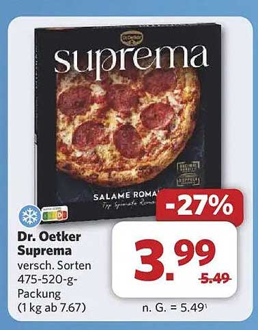 Momentan sind die Dr. Oetker Suprema Pizzen für nur 3,99 € erhältlich, im Vergleich zum regulären Preis von 5,49 €. Das entspricht einer Ersparnis von 1,50 € oder 27%! Profitieren Sie von diesem fantastischen Angebot und gönnen Sie sich eine köstliche Pizza zum Schnäppchenpreis.