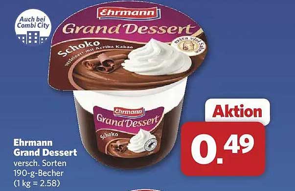 Sehen Sie sich jetzt das Ehrmann Grand Dessert versch. Sorten 190-g-Becher Angebot im Combi Prospekt an. Dieses Angebot ist gültig von 28.07.2025 bis 02.08.2025.