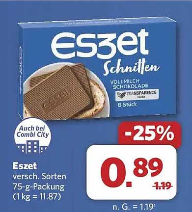 Sehen Sie sich das Eszet Schnitten Angebot bei Combi an! Dieses fantastische Angebot ist jetzt im neuesten Combi Prospekt verfügbar. Nutzen Sie diese Chance und sparen Sie viel bei Ihrem Einkauf.
