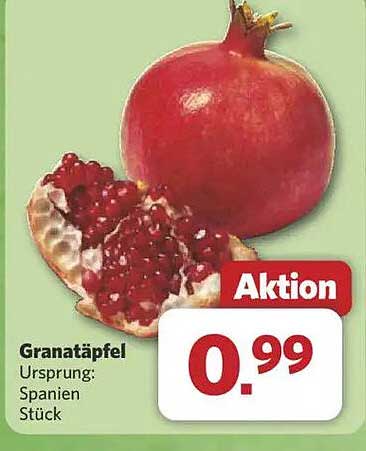 Der Granatapfel ist nicht nur ein wahrer Genuss, sondern auch eine geschmackvolle Bereicherung für jede Küche. Mit seinem süß-säuerlichen Geschmack erfreut er sich großer Beliebtheit und eignet sich bestens für Snacks, Salate oder auch als Bestandteil von Getränken. Aktuell bieten wir diesen köstlichen Granatapfel zum attraktiven Preis von nur 0,99 € an. Ein Angebot, das man sich nicht entgehen lassen sollte!