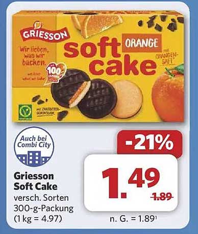 Sehen Sie sich jetzt das Griesson Soft Cake – Verschiedene Sorten in 300-g-Packung Angebot im Combi Prospekt an. Dieses Angebot ist gültig von 31.03.2025 bis 05.04.2025.