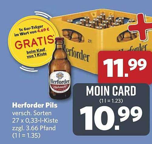 Der reguläre Preis für die Kiste Herforder Pils beträgt 11,99 €, doch im Rahmen dieses Angebots zahlen Sie nur 10,99 € mit der MOIN CARD. Das bedeutet eine Ersparnis, die sich sehen lassen kann! Zudem erhalten Sie bei jedem Kauf eine kostenlose 6er-Träger, was den Gesamtwert des Angebots weiter steigert. Warum mehr bezahlen, wenn Sie hier so viel sparen können?