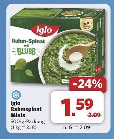 Sehen Sie sich jetzt das Iglo Rahmspinat Minis 500-g-Packung Angebot im Combi Prospekt an. Dieses Angebot ist gültig von 22.09.2025 bis 27.09.2025.
