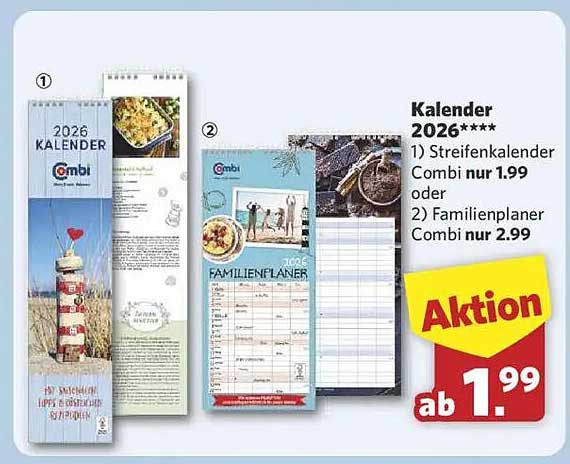 Sehen Sie sich jetzt das Kalender 2026**** - Streifenkalender und Familienplaner Angebot im Combi Prospekt an. Dieses Angebot ist gültig von 22.09.2025 bis 27.09.2025.
