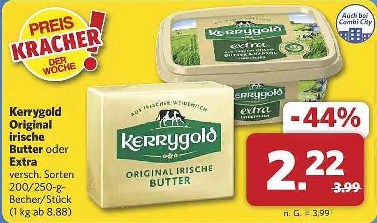 Sehen Sie sich das Kerrygold Original Irische Butter Angebot bei Combi an! Dieses fantastische Angebot ist jetzt im neuesten Combi Prospekt verfügbar. Nutzen Sie diese Chance und sparen Sie viel bei Ihrem Einkauf.