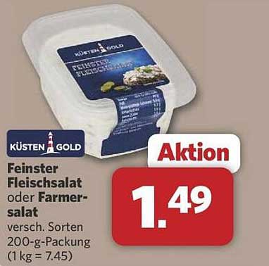 Sehen Sie sich jetzt das KÜSTEN GOLD Feiner Fleischsalat oder Farmersalat - 200 g Packung Angebot im Combi Prospekt an. Dieses Angebot ist gültig von 03.11.2025 bis 08.11.2025.
