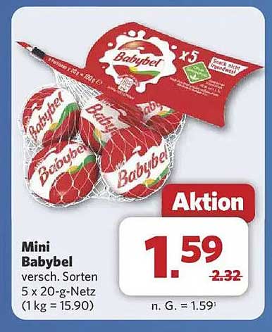 Jeder Mini Babybel wiegt 20 g. Das Produkt wird in einem Netz mit fünf Käsesorten geliefert und hat einen Kilopreis von nur 15,90 €. Hergestellt aus hochwertiger Milch, ist dieser Käse frei von künstlichen Aromen und Farbstoffen.
