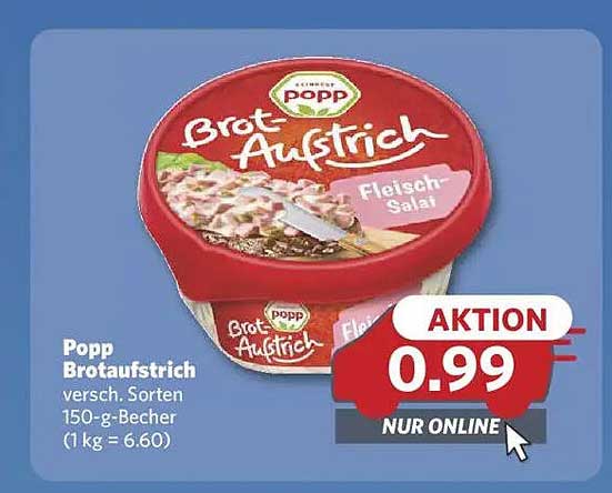 Entdecken Sie den köstlichen Popp Brotaufschnitt in verschiedenen Geschmacksrichtungen. Ob zu Hause beim Frühstück, Mittagessen oder beim gemütlichen Abendbrot - dieser Aufstrich bringt frischen Wind auf Ihr Brot. Mit einem Preis von nur 0,99 € ist dieses Angebot nicht nur lecker, sondern auch unschlagbar günstig!