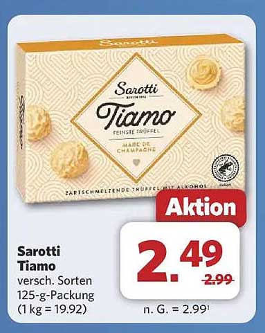 Der aktuelle Preis von nur 2,49 € macht dieses Angebot besonders attraktiv, da der Normalpreis bei 2,99 € liegt. Das bedeutet eine Ersparnis von 0,50 €, was Ihnen ermöglicht, sich ohne schlechtes Gewissen zu verwöhnen. Gönnen Sie sich die Sarotti Tiamo Trüffel zu einem unschlagbaren Preis und genießen Sie den Luxus zu Hause.