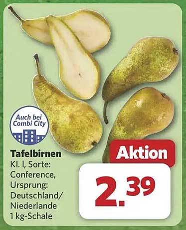 Sehen Sie sich jetzt das Tafelbirnen Kl. I, Sorte: Conference, 1 kg-Schale Angebot im Combi Prospekt an. Dieses Angebot ist gültig von 31.03.2025 bis 05.04.2025.