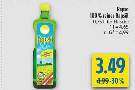 Sehen Sie sich jetzt das Rapso 100 % reines Rapsöl 0,75 Liter Flasche Angebot im diska Prospekt an. Dieses Angebot ist gültig von 17.11.2025 bis 22.11.2025.