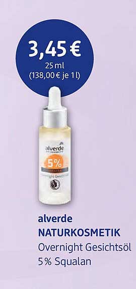 Sehen Sie sich das Alverde Naturkosmetik Overnight Gesichtsöl 5% Squalan Angebot bei dm an! Dieses fantastische Angebot ist jetzt im neuesten dm Prospekt verfügbar. Nutzen Sie diese Chance und sparen Sie viel bei Ihrem Einkauf.