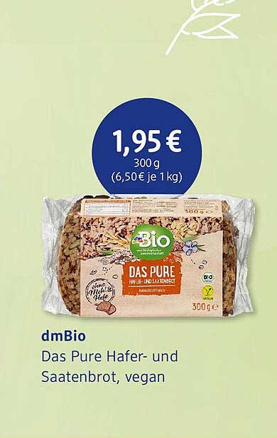 Sehen Sie sich das Dmbio Das Pure Hafer- Und Saatenbrot, Vegan Angebot bei dm an! Dieses fantastische Angebot ist jetzt im neuesten dm Prospekt verfügbar. Nutzen Sie diese Chance und sparen Sie viel bei Ihrem Einkauf.
