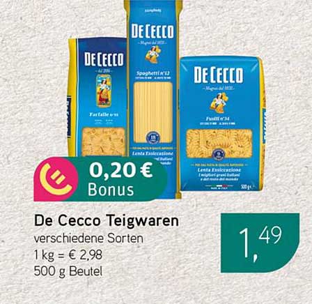 Sehen Sie sich jetzt das De Cecco Teigwaren verschiedene Sorten Angebot im Dornseifer Prospekt an. Dieses Angebot ist gültig von 06.10.2025 bis 11.10.2025.