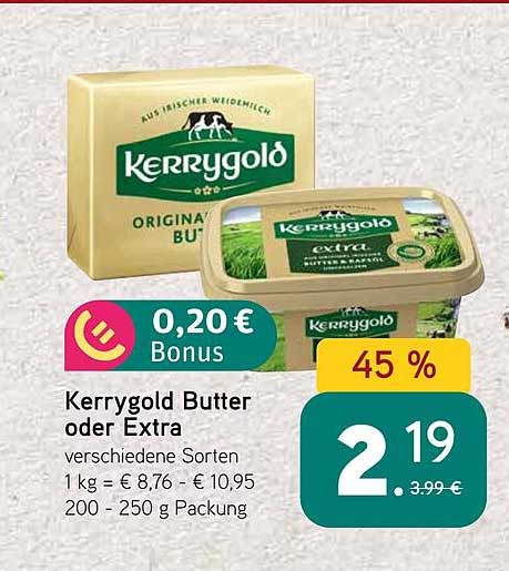 Der aktuelle Preis für die Kerrygold Butter oder Extra liegt bei nur 2,19 €. Das bedeutet eine beeindruckende Ersparnis von 45 % im Vergleich zum regulären Preis von 3,99 €. Nutzen Sie diese Gelegenheit, um hochwertige Butter zu einem unschlagbaren Preis zu erwerben!