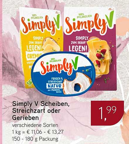Sehen Sie sich jetzt das Simply V Scheiben, Streichzart oder Gerieben - verschiedene Sorten Angebot im Dornseifer Prospekt an. Dieses Angebot ist gültig von 20.10.2025 bis 25.10.2025.