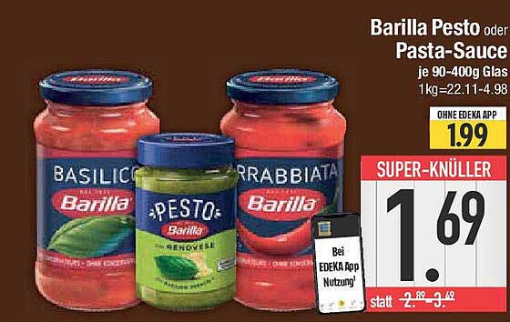 Für nur 1,69 Euro (statt 2,99 Euro) erhalten Sie ein Glas der Barilla Pesto oder Pasta-Sauce. Das ist ein unschlagbarer Preis für Produkte von solch hochwertiger Qualität. Vergleicht man den ursprünglichen Preis, können Sie bei diesem Angebot nicht nur Geld sparen, sondern gleichzeitig auch in Genuss und Qualität investieren – ein echtes Schnäppchen auf dieser Seite!