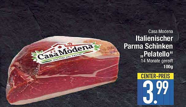 Sehen Sie sich jetzt das Casa Modena Italienischer Parma Schinken „Pelatello“ 14 Monate gereift 100g Angebot im E-Center Prospekt an. Dieses Angebot ist gültig von 12.10.2025 bis 18.10.2025.