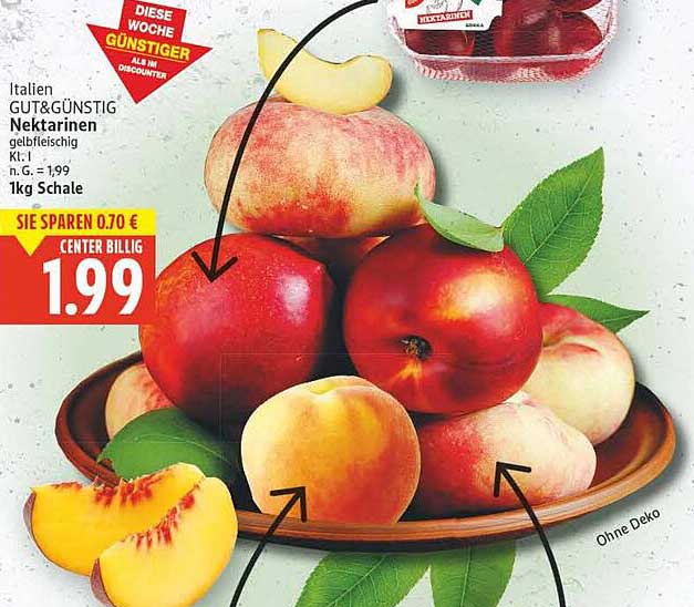 Aktuell erhalten Sie die köstlichen Nektarinen für nur 1,99 €, was einer Ersparnis von 0,70 € im Vergleich zum regulären Preis entspricht. Dies ist eine einmalige Gelegenheit, sich mit gesundem und schmackhaftem Obst einzudecken, ohne dabei das Budget zu sprengen.