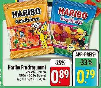 Im aktuellen Angebot sind die Haribo Fruchtgummis um 25 % reduziert, was einen neuen Preis von nur 0,79 € bedeutet. Im Vergleich zum regulären Preis von 0,89 € ist das eine Ersparnis von 0,10 €. Ein hervorragendes Angebot, wenn man bedenkt, dass 1 kg der beliebten Fruchtgummis nur 4,34 € kostet!