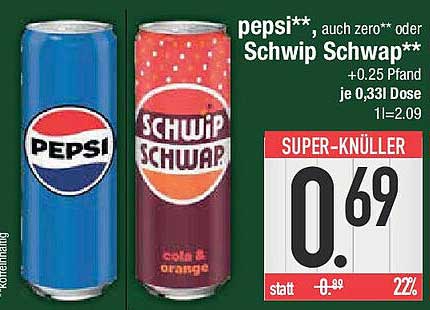 Freunde des Erfrischungsgetränks aufgepasst! Dieses Angebot umfasst die beliebten Limonaden pepsi**, auch in der zuckerfreien Variante zero**, sowie die fruchtig-spritzige Schwip Schwap**. Diese Getränke sind ideal für heiße Sommertage, Grillpartys oder einfach zum Entspannen auf der Couch.