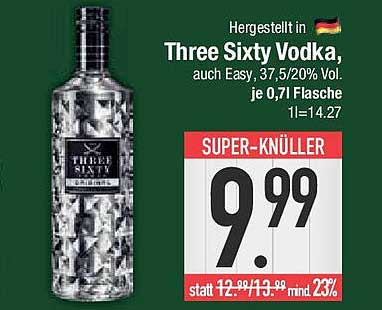 Sehen Sie sich jetzt das Three Sixty Vodka 0,7 l Flasche für nur 9,99 € Angebot im E-Center Prospekt an. Dieses Angebot ist gültig von 12.10.2025 bis 18.10.2025.