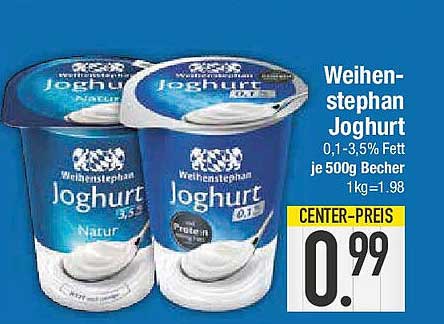 Sehen Sie sich jetzt das Weihenstephan Joghurt 0,1%-3,5% Fett je 500g Becher Angebot im E-Center Prospekt an. Dieses Angebot ist gültig von 28.09.2025 bis 04.10.2025.