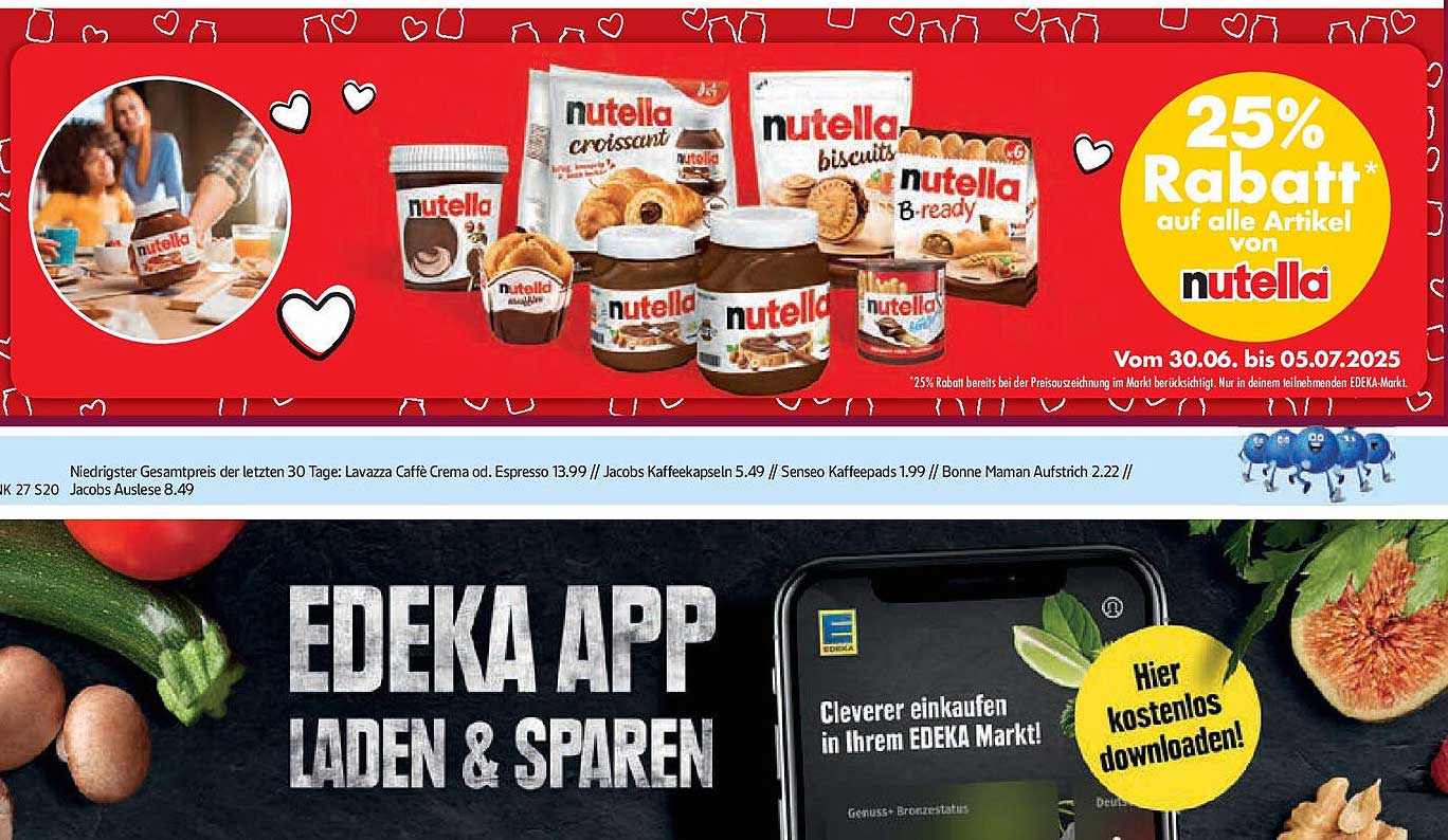 Sehen Sie sich jetzt das 25% Rabatt auf alle Artikel von Nutella Angebot im Edeka Prospekt an. Dieses Angebot ist gültig von 29.06.2025 bis 05.07.2025.