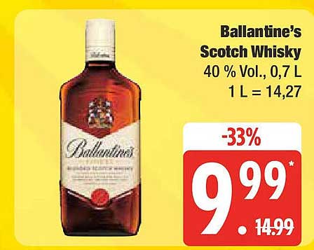 Sehen Sie sich das Ballantine's Scotch Whisky Angebot bei Edeka an! Dieses fantastische Angebot ist jetzt im neuesten Edeka Prospekt verfügbar. Nutzen Sie diese Chance und sparen Sie viel bei Ihrem Einkauf.