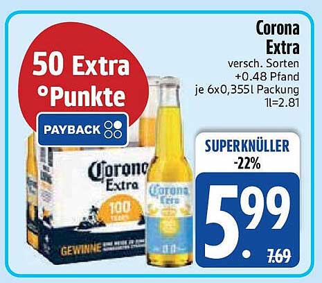Aktuell wird Corona Extra zum Preis von nur 5,99 € angeboten. Im Vergleich zum Normalpreis von 7,69 € ergibt sich eine Ersparnis von satten 22 %. Das bedeutet: Du sparst nicht nur Geld, sondern bekommst auch die Möglichkeit, mehr von deinem Lieblingsbier zu genießen. Ein einmaliges Angebot, das du nicht verpassen solltest!