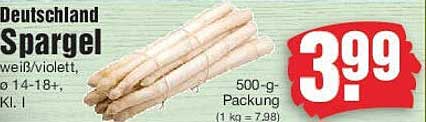Sehen Sie sich jetzt das Deutschland Spargel weiß/violett, 500-g-Packung Angebot im Edeka Prospekt an. Dieses Angebot ist gültig von 07.05.2025 bis 10.05.2025.