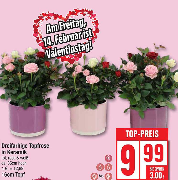 Sehen Sie sich jetzt das Dreifarbige Toprose in Keramik Angebot im Edeka Prospekt an. Dieses Angebot ist gültig von 10.02.2025 bis 15.02.2025.
