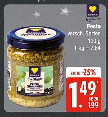 Sehen Sie sich jetzt das EDEKA Herrstück Pesto versch. Sorten Angebot im Edeka Prospekt an. Dieses Angebot ist gültig von 22.12.2024 bis 28.12.2024.